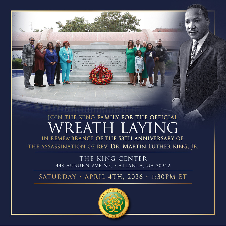 Join the King Family for the official wreath laying ceremony in remembrance of the 58th Anniversary of the Assassination of Rev. Dr. Martin Luther King, Jr. This annual gathering invites the community to stand together in reflection, gratitude, and renewed commitment to Dr. King’s enduring legacy of justice, nonviolence, and Beloved Community. Held on the historic grounds of The King Center, this moment of remembrance offers space to honor the past while inspiring the work that still lies ahead.