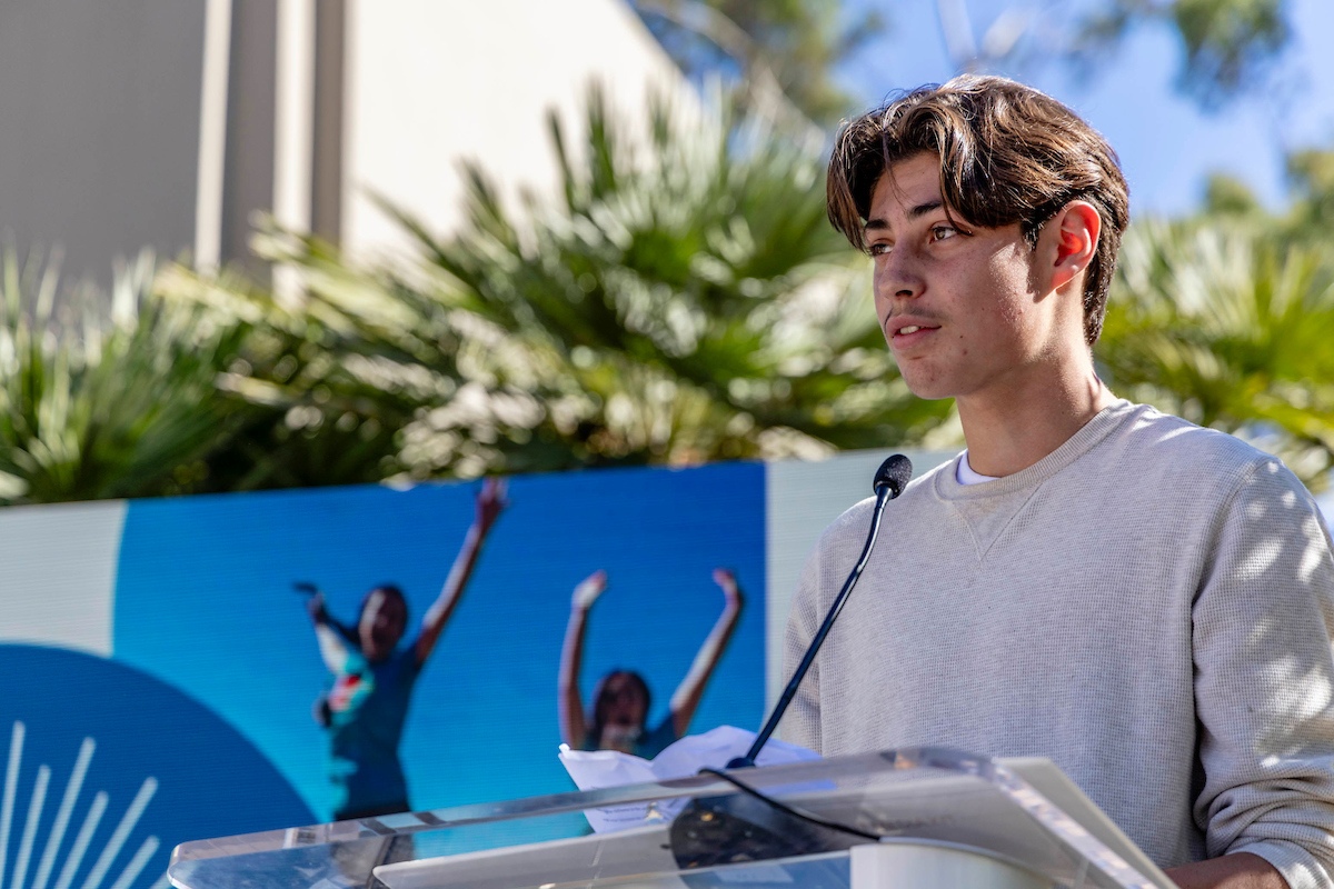 MLKSB 2024 Essay award winner Benke Sepulveda, (Dune School, Santa Ynez, CA) reads his essay at the Michael Towebs Library Plaza Opening Festival ribbon-cutting ceremony and - PLAZA PALOOZA! Santa Barbara Public Library downtown Santa Barbara, CA on November 3, 2024. (Photo by Rod Rolle)
