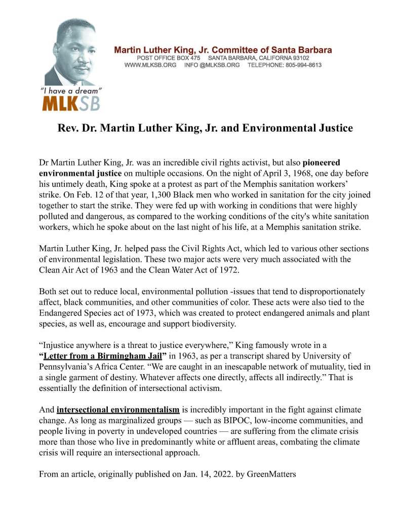 An initiative on Environmental Justice for the MLKSB represents the strong link between environmental equity and the legacy of Dr. Martin Luther King, Jr. Since minority and underrepresented communities are disproportionately affected by environmental racism and climate change impacts. MLKSB would like to create and promote an initiative that combines educational efforts and advocacy. Advocating for clean air and climate justice is not just a political issue, but also a moral imperative. Minority and underrepresented communities bear the heaviest burden of pollution, extreme weather, and toxic practices. We plan to develop a program that will empower local, often-overlooked neighborhoods to build climate resilience and foster environmental stewardship. In Santa Barbara that would be the lower east side.